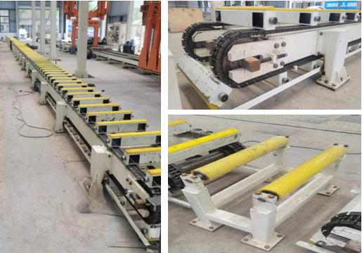 采用16A双排链条,链条上安装橡胶块,前后橡胶块间隔短,有效防止板材输送过程中的断裂。